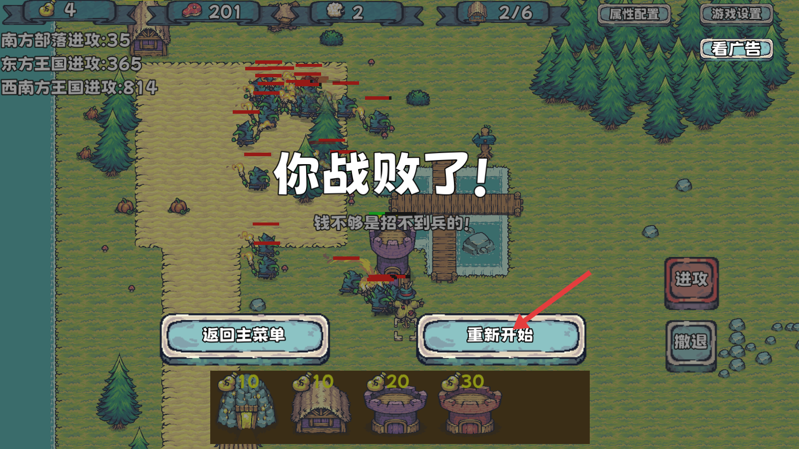 4、若战败出现【你战败了!】提示,点击【重新开始】,调整建筑建造与进攻策略,再次挑战。