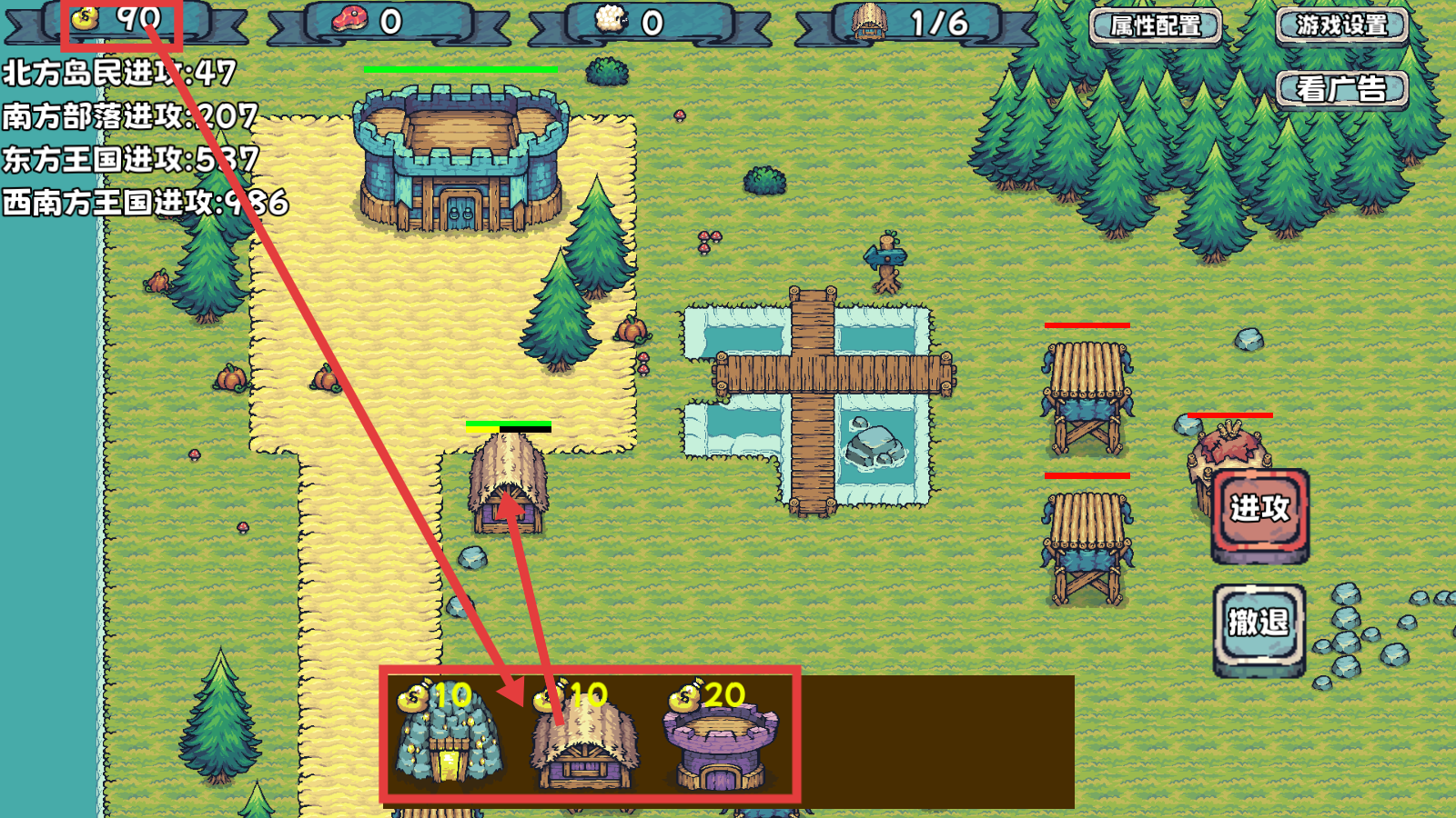 2、使用初始金币(如【90】),建造标价【10】或【20】的建筑,搭建防御体系或提升资源产出。