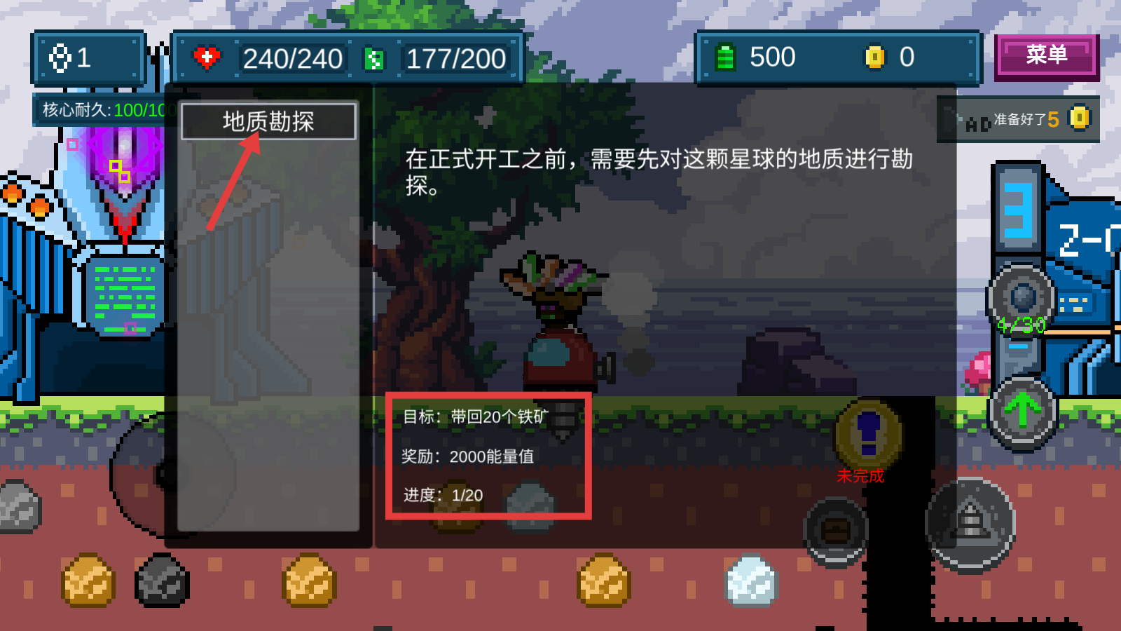 2、接取【地质勘探】任务,目标是带回20个铁矿,完成可获2000能量值,积累前期资源。