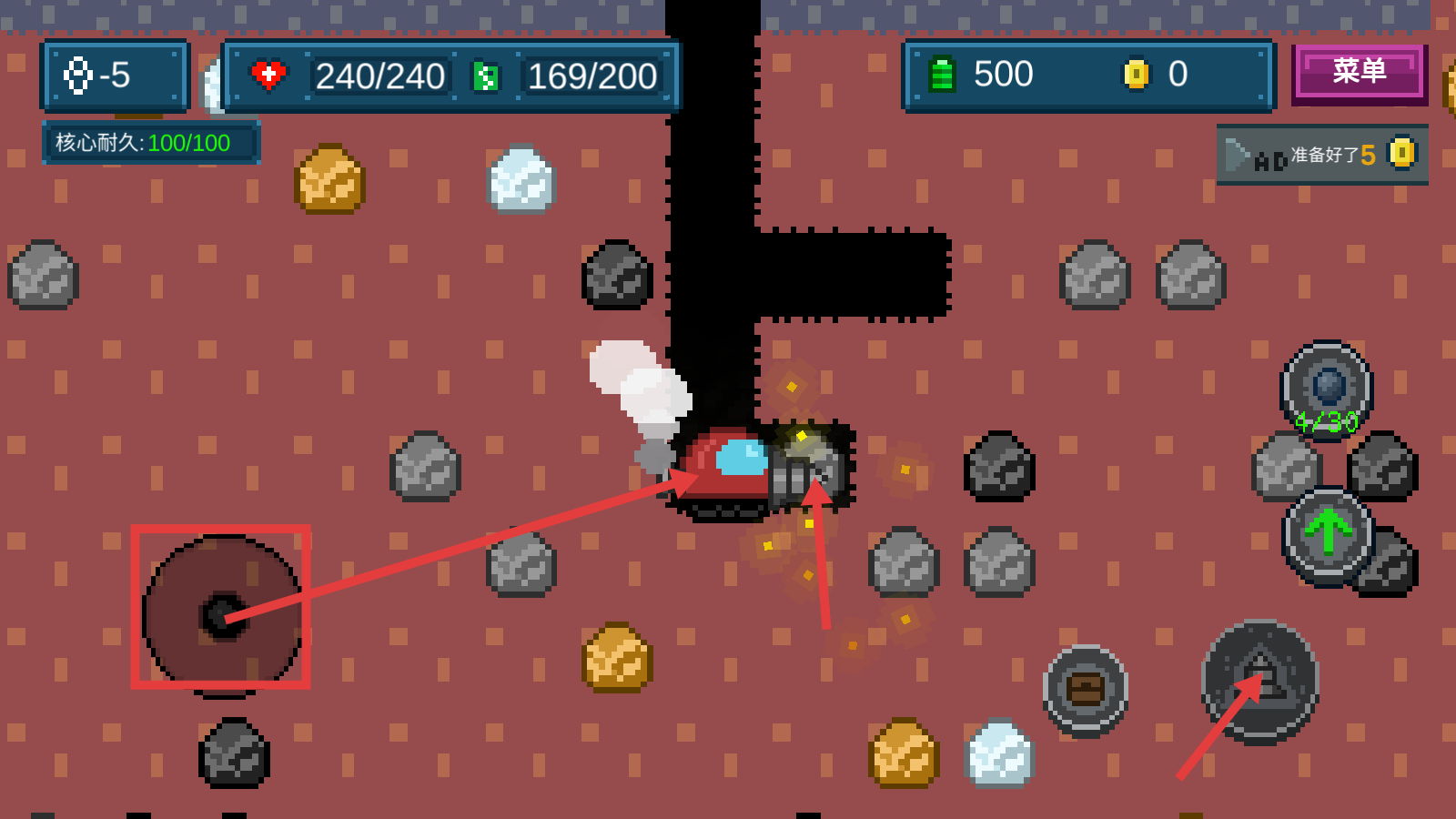 3、操控钻头机器,在地下区域挖掘矿石,收集铁矿等资源,留意机器的耐久与能耗情况。