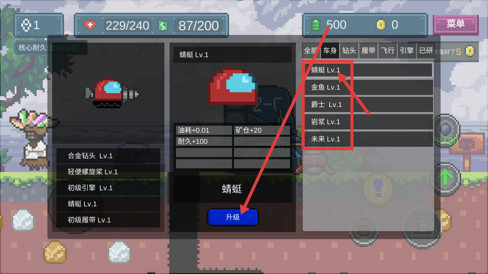 4、进入升级界面,选择【蜻蜓-Lv.1】等载具,点击【升级】提升性能,方便后续探索挖矿。