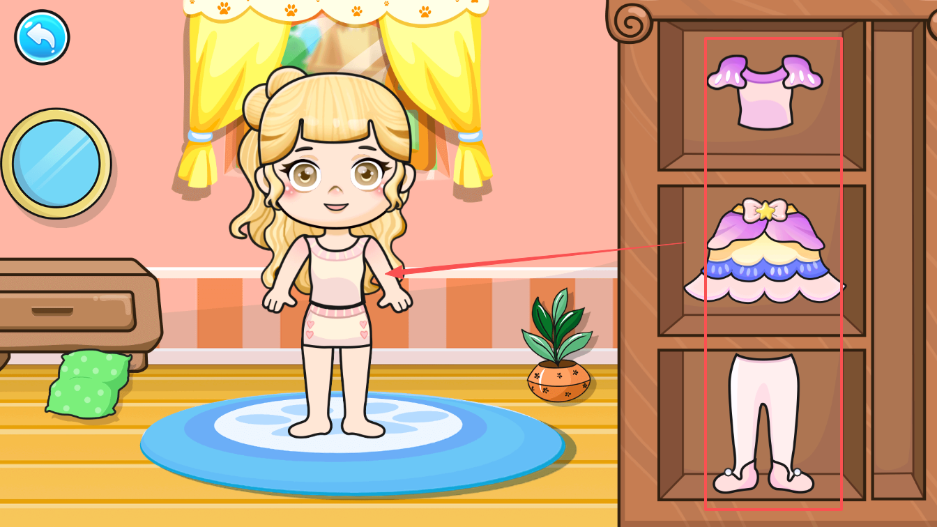 2、进行公主装扮:从服饰库中挑选好看衣服、配饰,为公主搭配造型,自由组合色彩与款式,在装扮过程中提升审美与色彩认知能力。