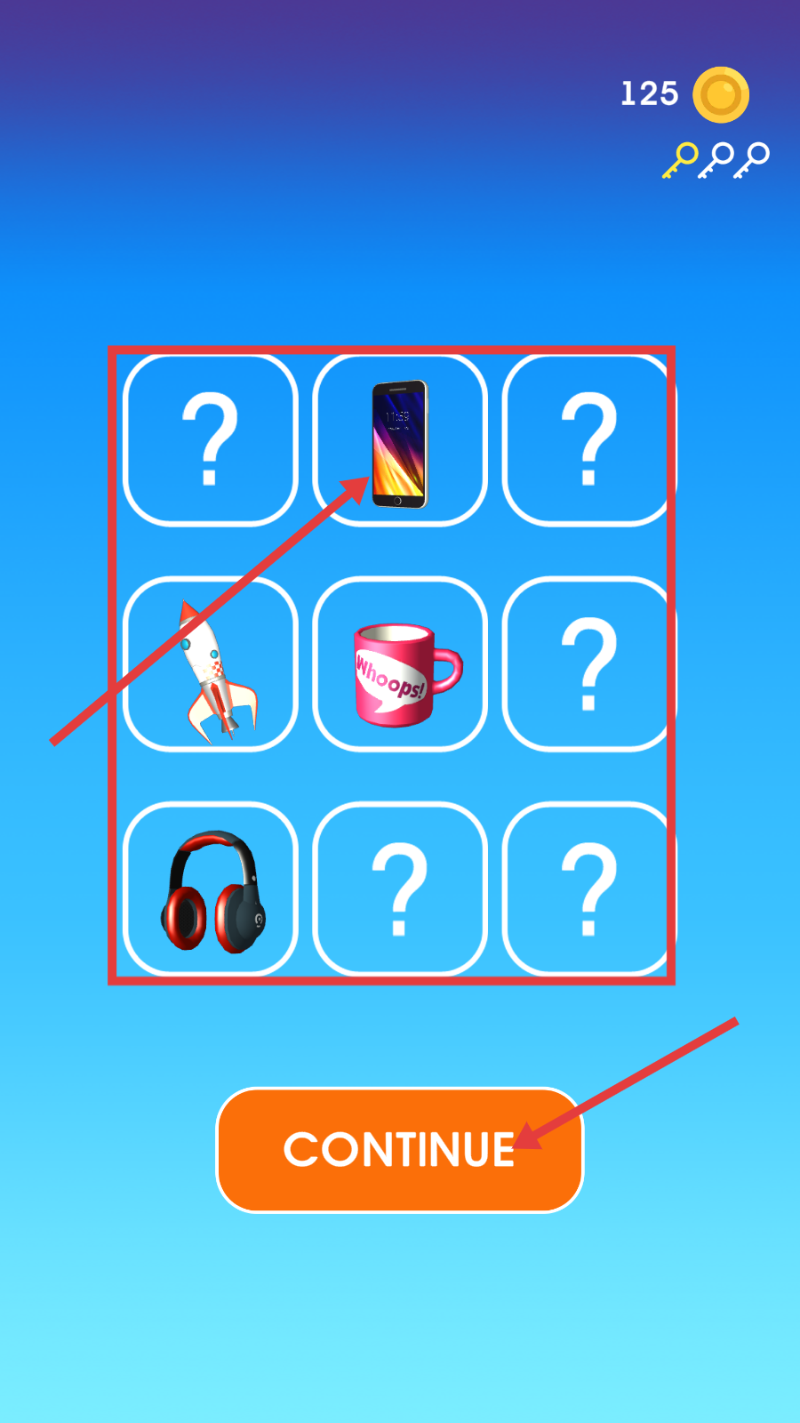 4、关卡结束后,会出现包含手机、火箭等物品的选择界面,选择后点击【CONTINUE】按钮继续游戏。