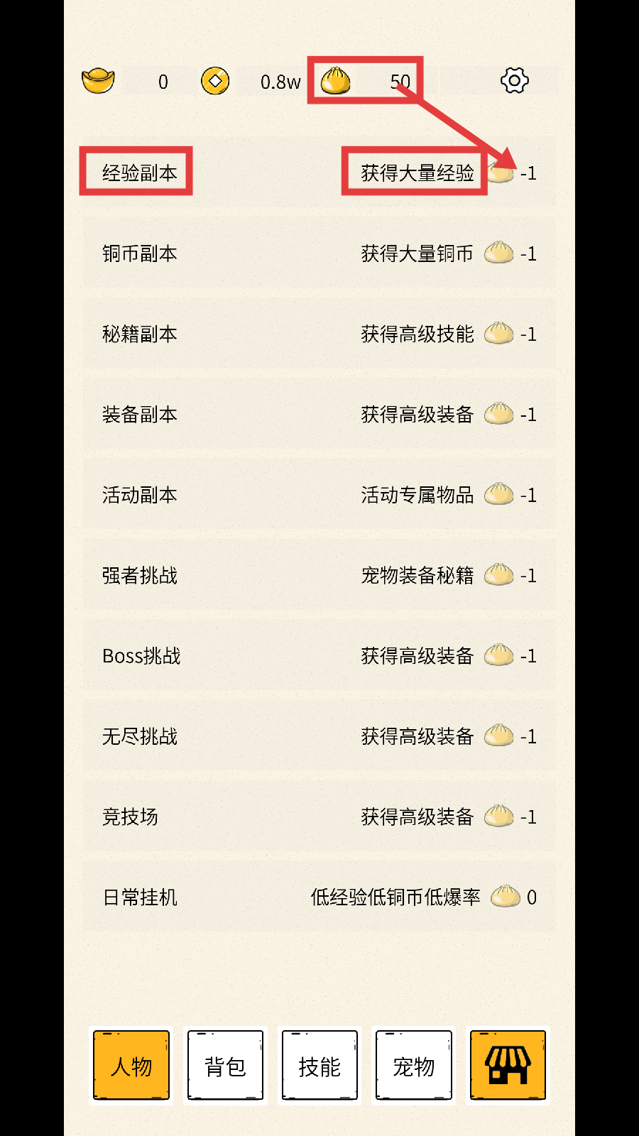 2、在副本选择界面,消耗【包子-50】中的1个,进入【经验副本】,能获得大量经验,快速提升等级。
