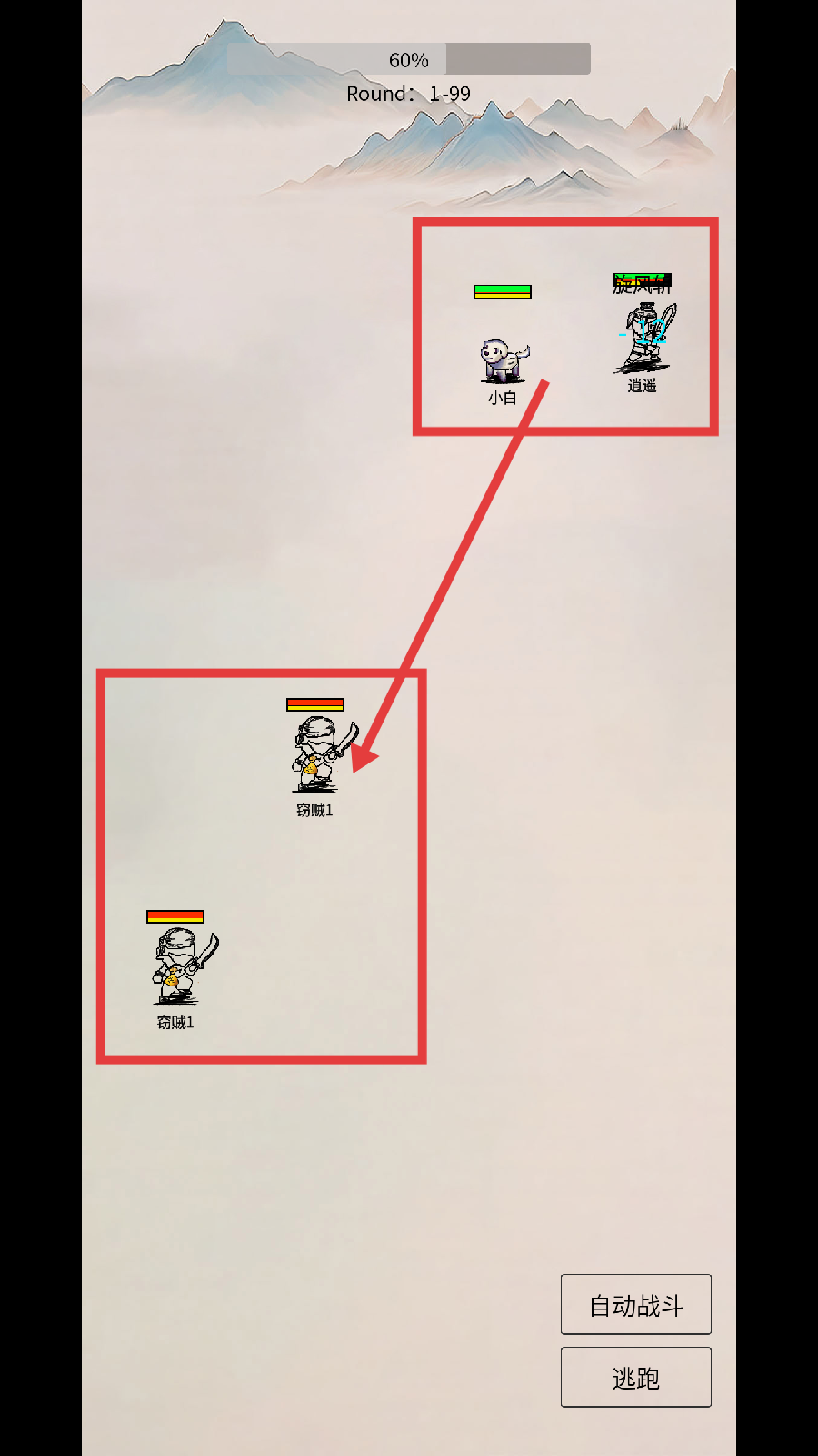 3、进入战斗后,操控角色“小白”和“逍遥”,对抗“窃贼1”,也可点击【自动战斗】按钮,让角色自动作战。