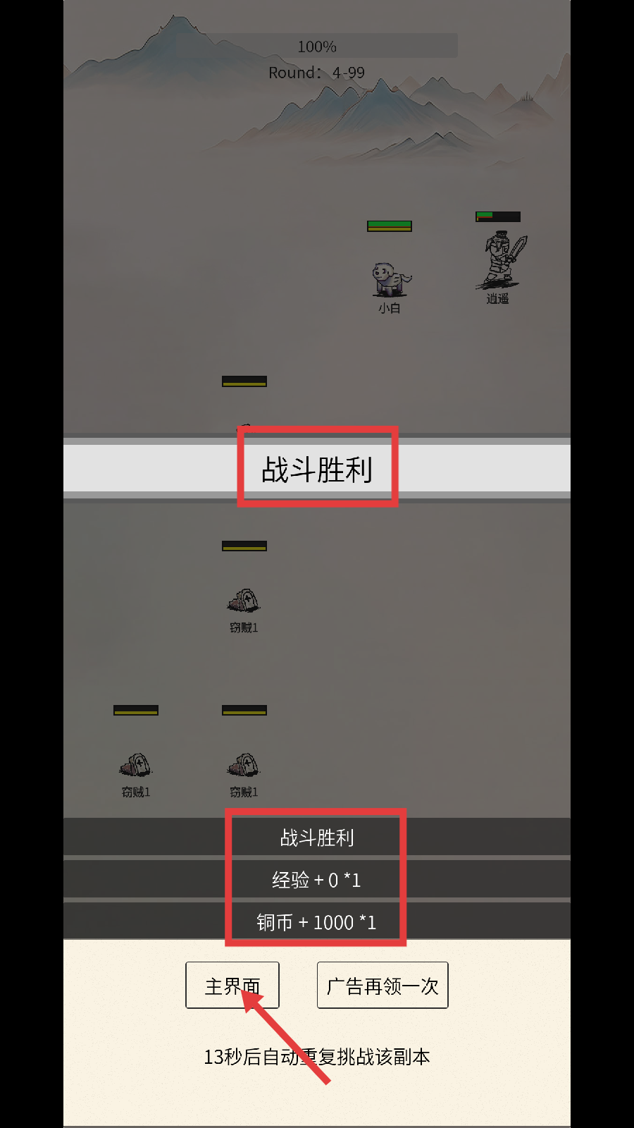 4、战斗胜利后,会获得【铜币+1000*1】等奖励,点击【主界面】按钮,可返回游戏主界面,准备下一次挑战。
