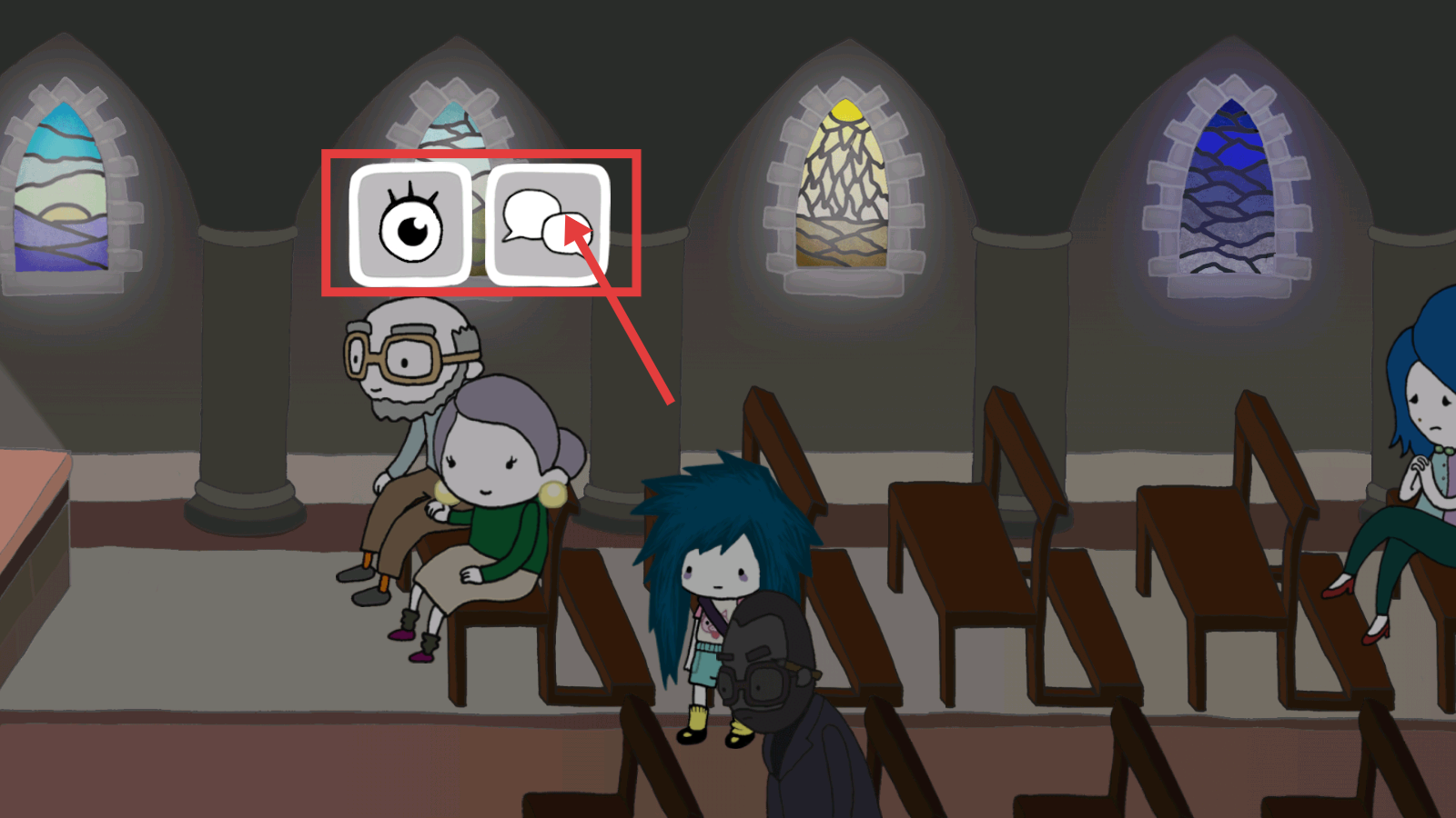 2、当界面出现【眼睛】和对话气泡图标时,点击对话气泡图标,开启与角色的对话以推进剧情。