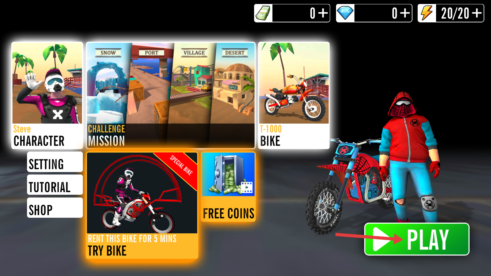 1、在游戏主界面,可选择角色与摩托车,随后点击绿色【PLAY】按钮,即可开启关卡挑战。