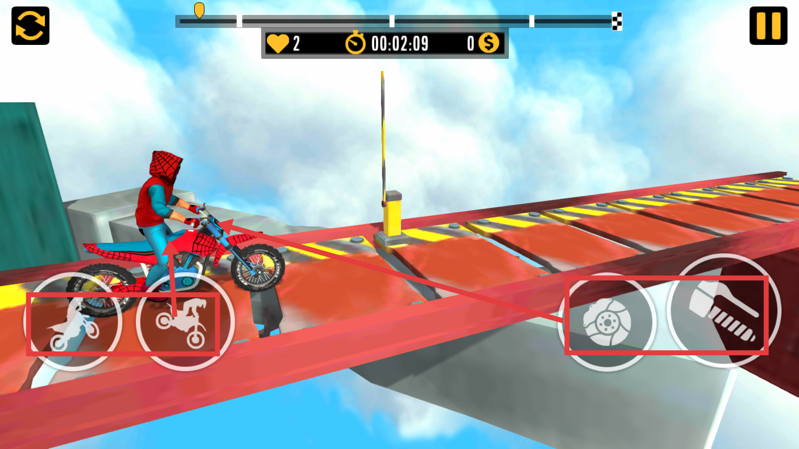 2、关卡内,借助左侧骑行姿势按钮,搭配右侧刹车、加速按钮,控制摩托车的平衡与速度,平稳通过赛道机关。