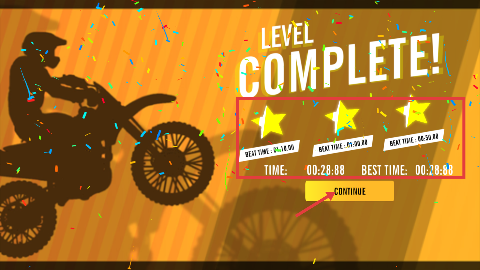 4、成功通关后,界面会显示关卡完成时间与星级评价,点击【CONTINUE】按钮,可继续挑战下一关。