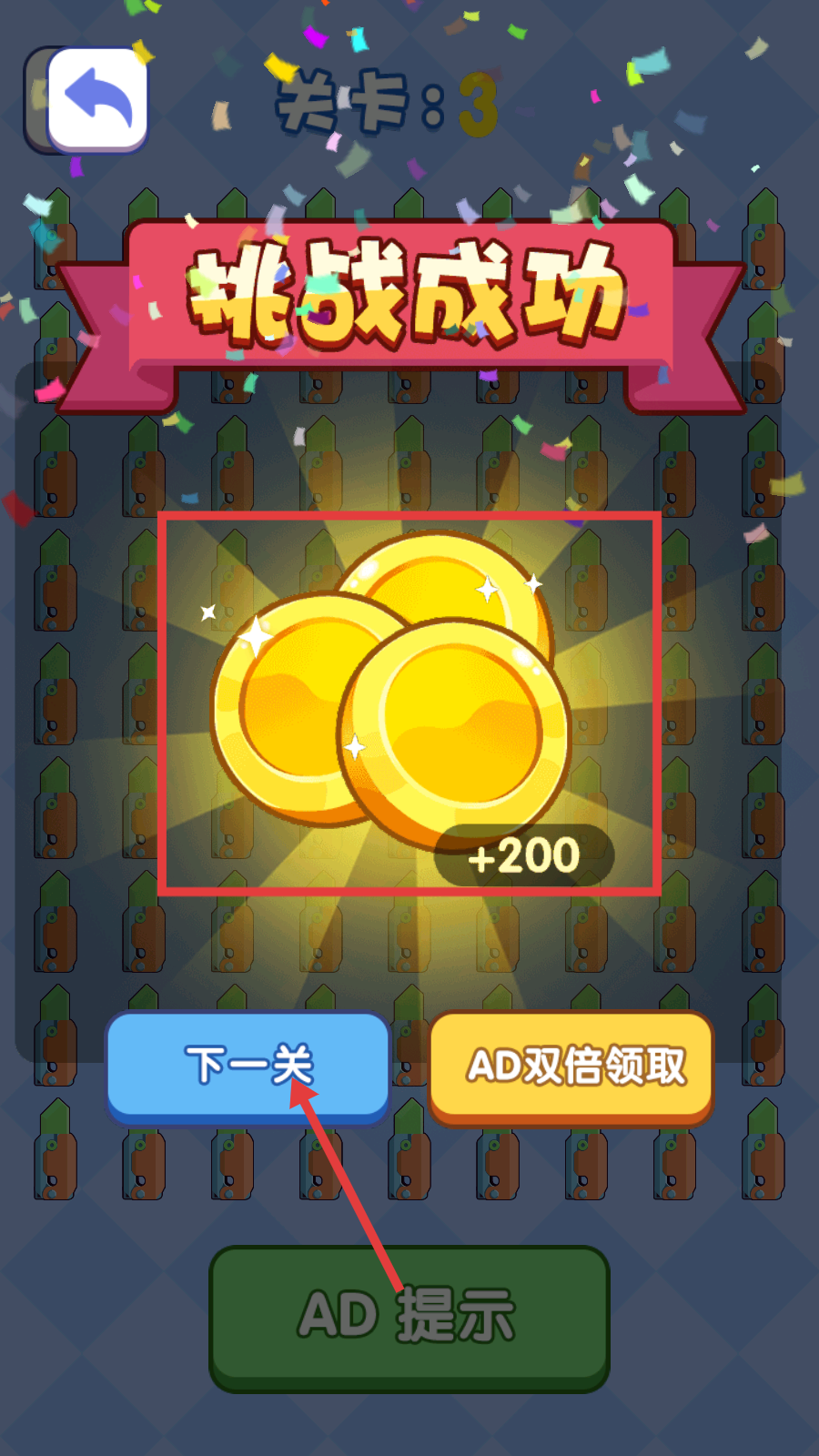 4、挑战成功后,可获得【+200】金币,点击【下一关】按钮,继续后续关卡挑战。