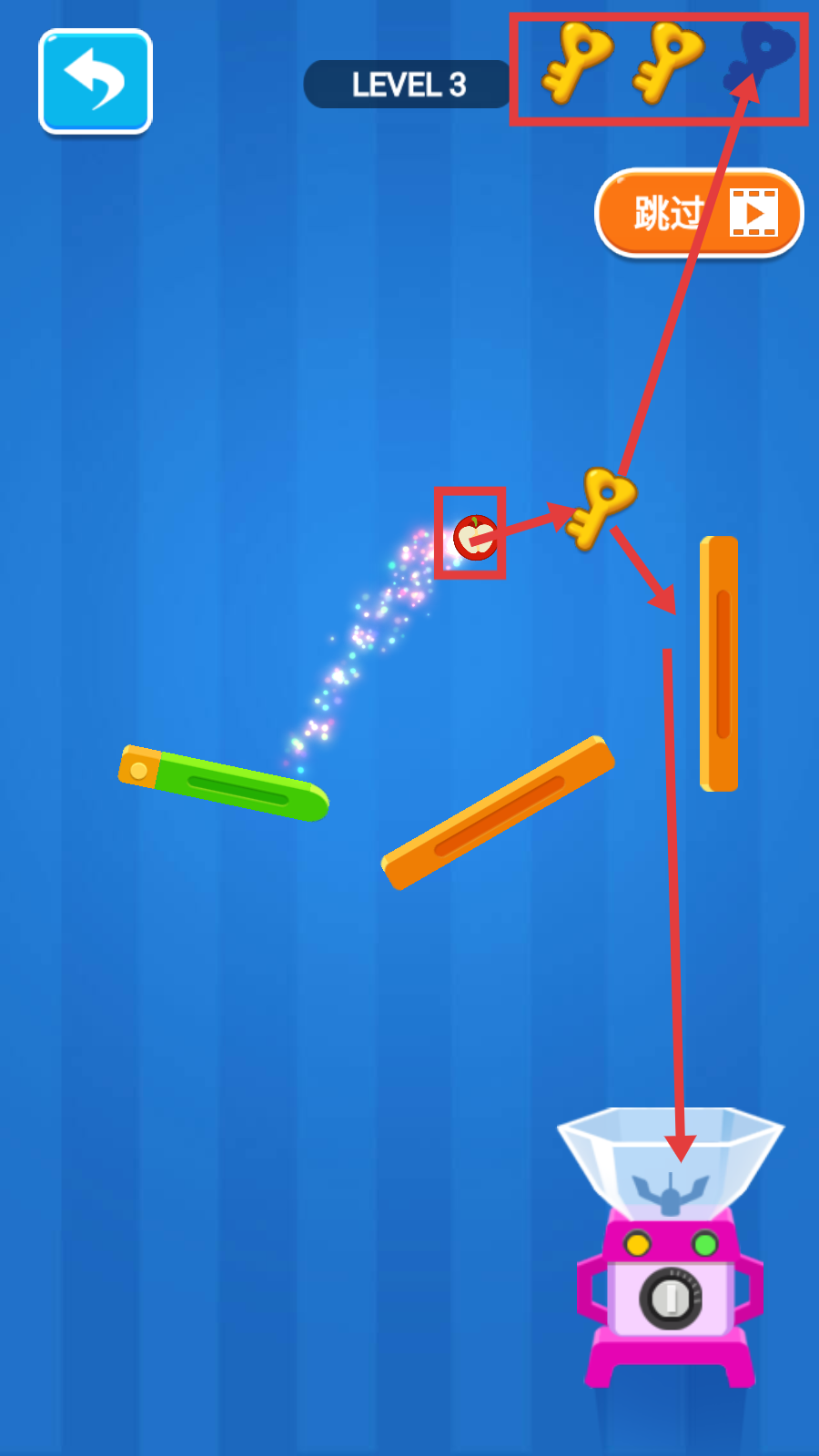 2、在【LEVEL3】里,借助绿色弹板弹射苹果,瞄准钥匙规划弹射路径。