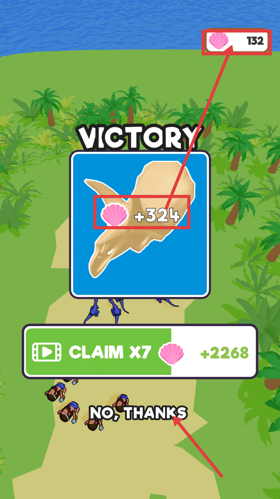 4、战斗胜利后界面显示【VICTORY】,可获得【+324】贝壳,若无需双倍奖励,点击【NO,-THANKS】,积累贝壳用于后续发展。