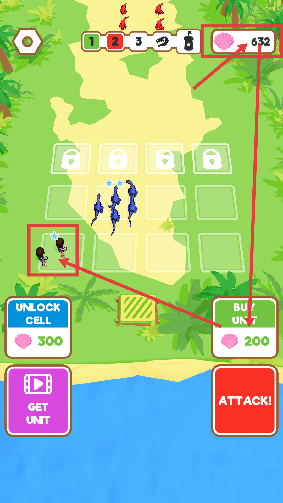 1、查看右上角贝壳数量【632】,点击【BUYUNIT-200】,消耗贝壳购买单位并部署到对应格子,为战斗筹备力量。