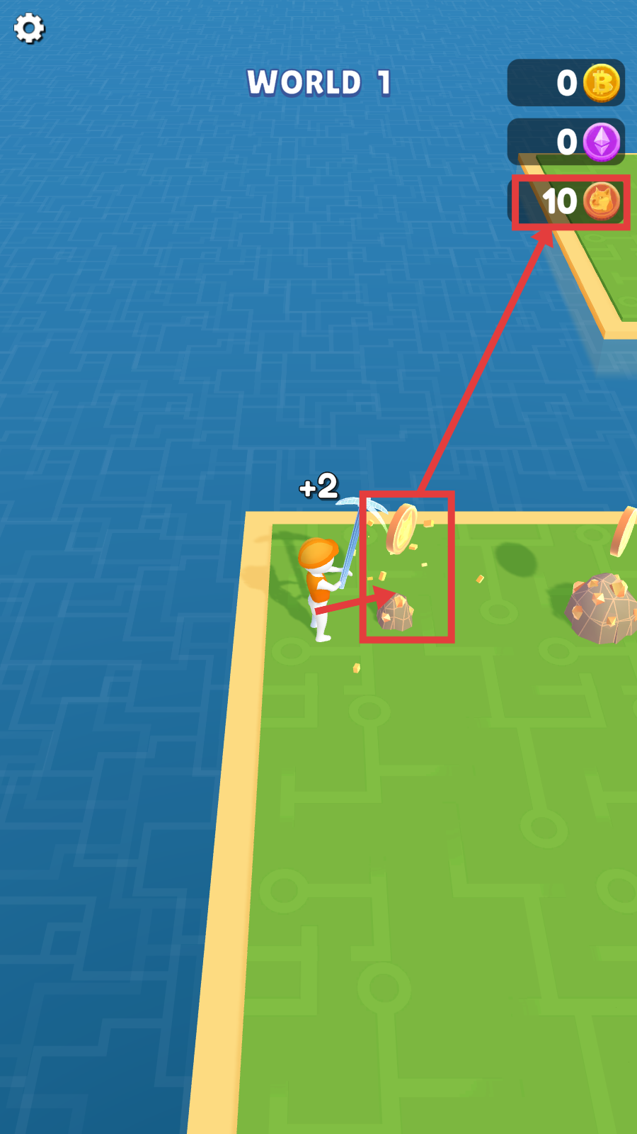 2、在【WORLD1】场景中,操控角色敲击石块,收集资源,积累右上角的橙色货币。