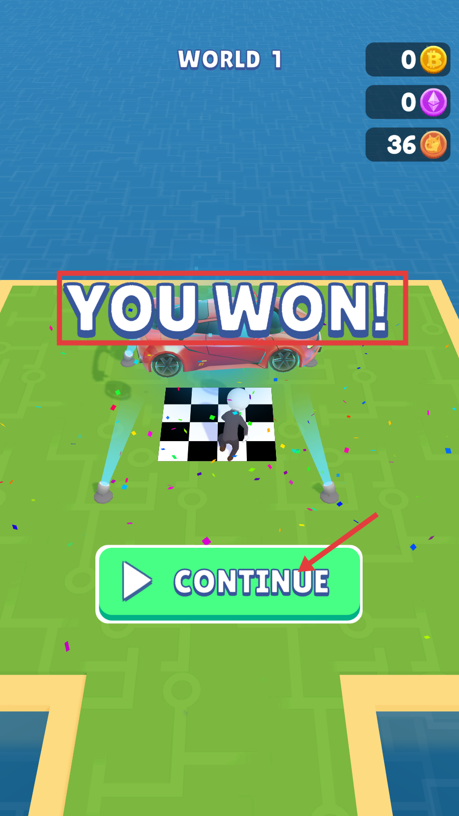 4、到达目标区域后,界面显示【YOUWON!】,点击【CONTINUE】按钮,继续后续关卡挑战。