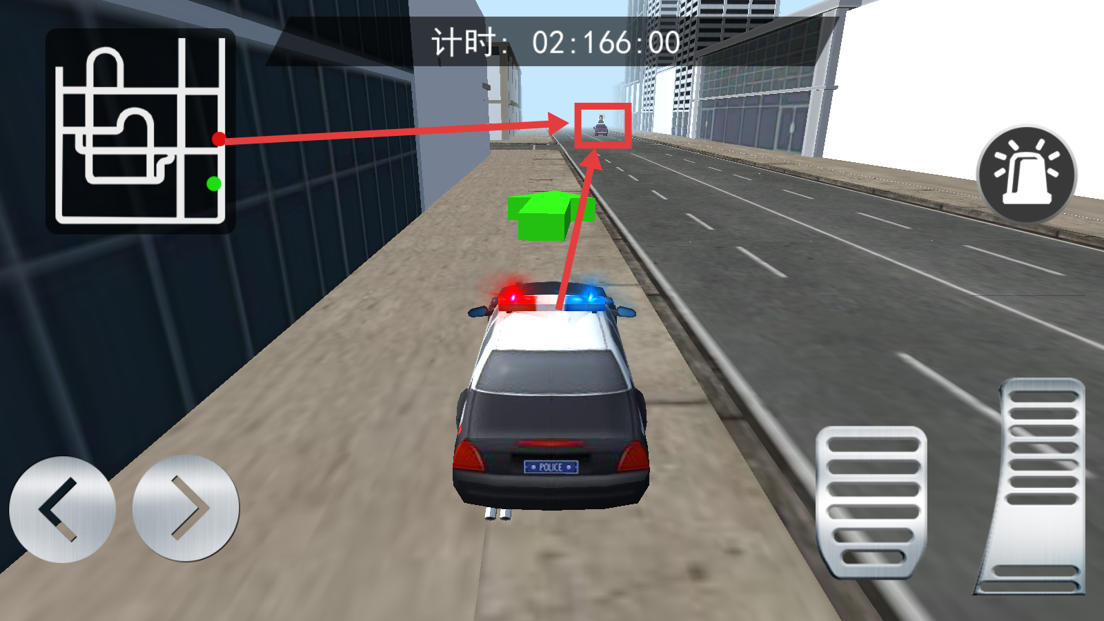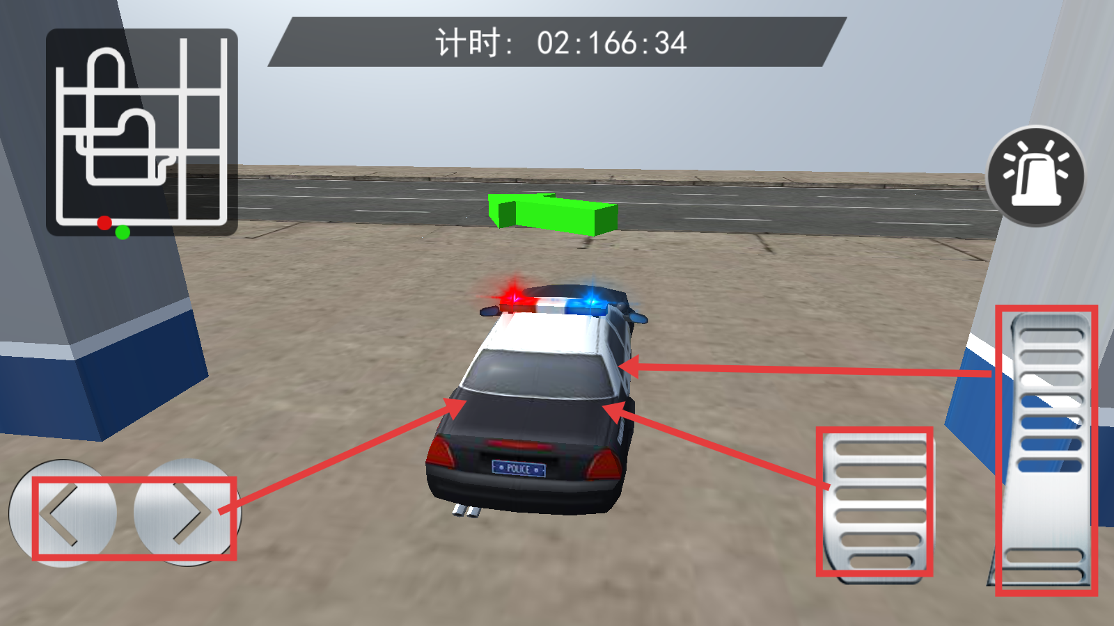 2、通过左侧方向键和右侧踏板,操控警车移动,熟悉驾驶操作,为后续追击目标做准备。