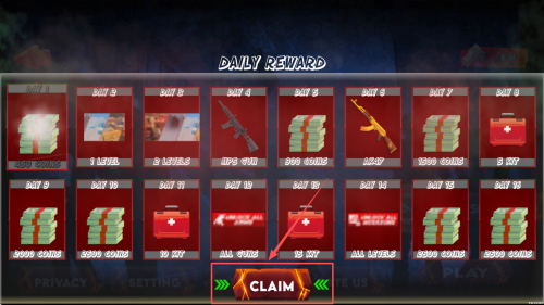 1、如何领取每日奖励?点击“CLAIM”按钮,领取每日登录奖励,包括金币、武器和补给品。