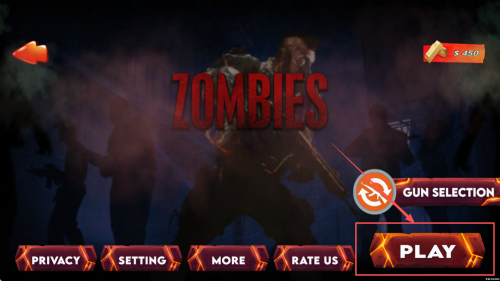 2、如何开始游戏?点击“PLAY”按钮,进入游戏主界面,准备开始射击僵尸。