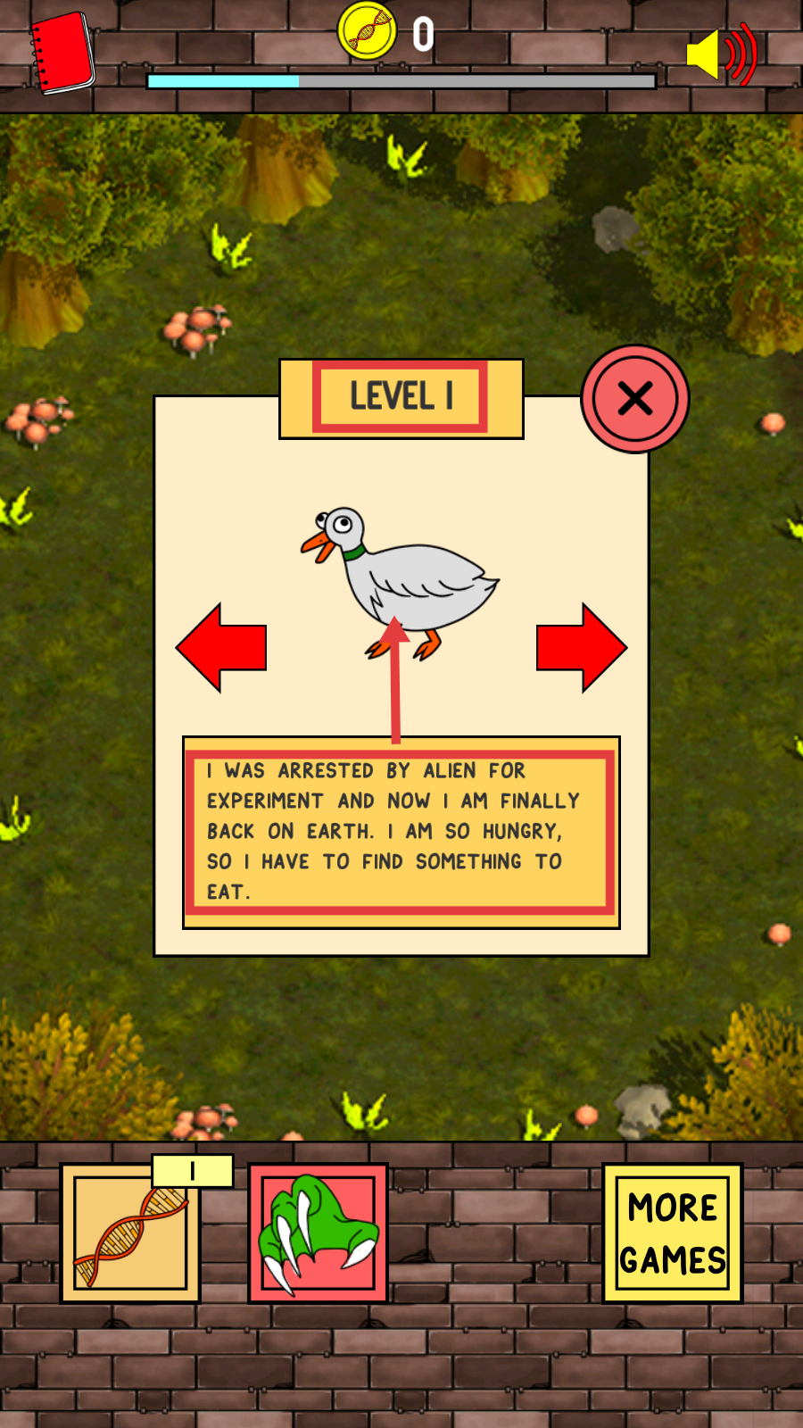 1、进入【LEVEL-1】,了解鸭子被外星人实验后回到地球、急需找食物的背景,为后续探索做好准备。