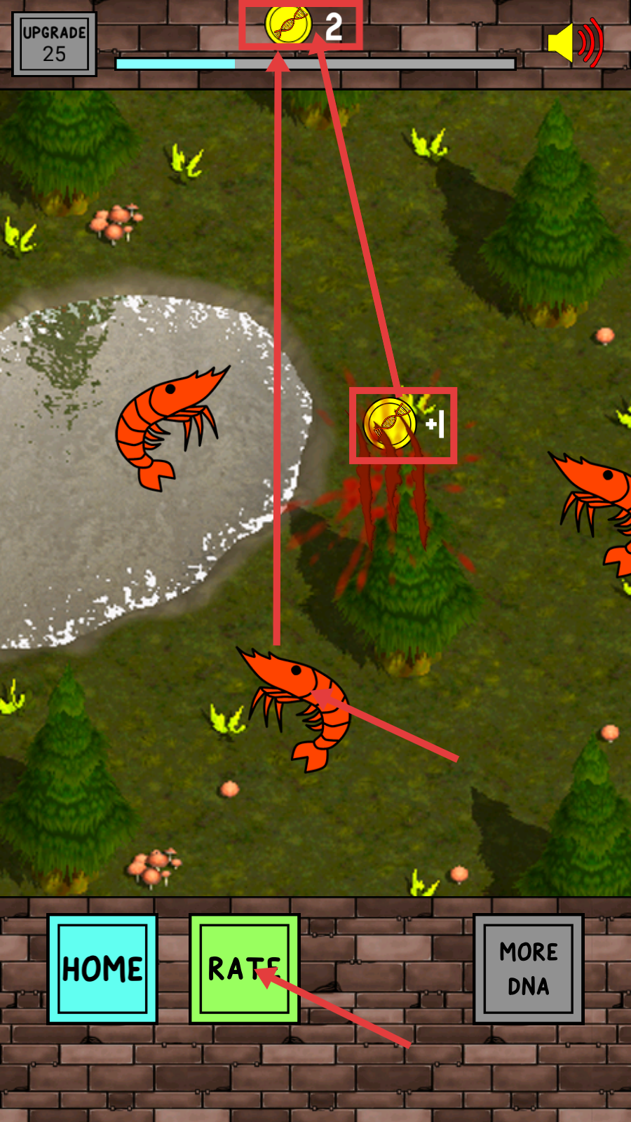 2、在关卡中捕捉红色的虾,同时收集【DNA-金币】,积累的资源可用于后续升级等操作。