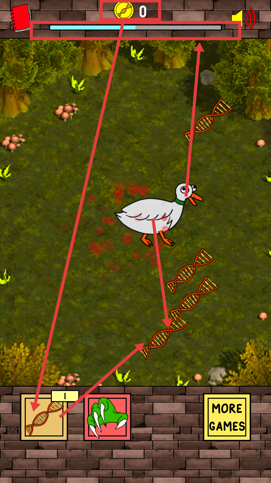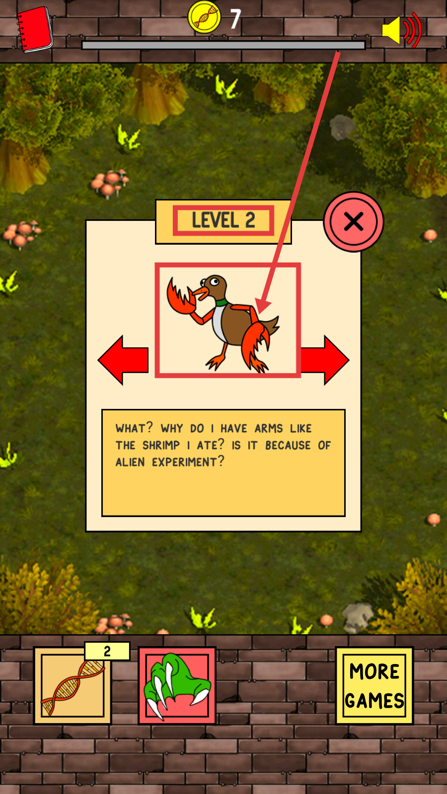 4、进入【LEVEL-2】,发现鸭子因食用虾出现肢体变化,继续探索外星人实验带来的更多变异与关卡内容。