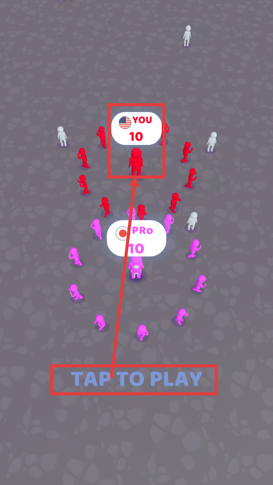 1、点击【TAP-TO-PLAY】开始游戏,操控代表【YOU】的红色人群,初始人数为10,和其他队伍人数一致。