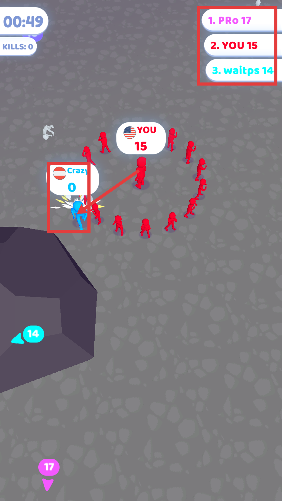 3、留意右上角排名,当遇到人数少的队伍如【Crazy】时,指挥【YOU】的人群发起攻击,抢夺对方人数。