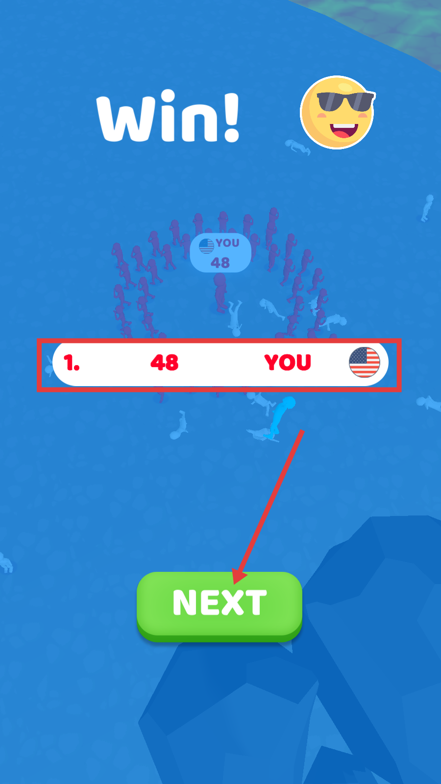 4、当己方人数(如【YOU】达到48)领先并获胜后,点击绿色【NEXT】按钮进入下一局游戏。