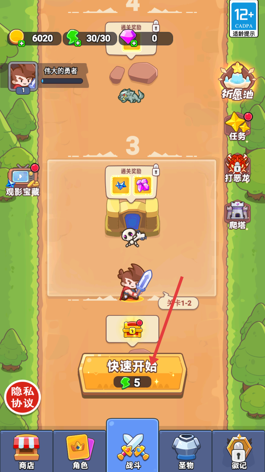 1、进入游戏战斗界面,点击【快速开始】按钮,消耗5点绿色资源,即可进入【关卡1-2】,开启战斗挑战。