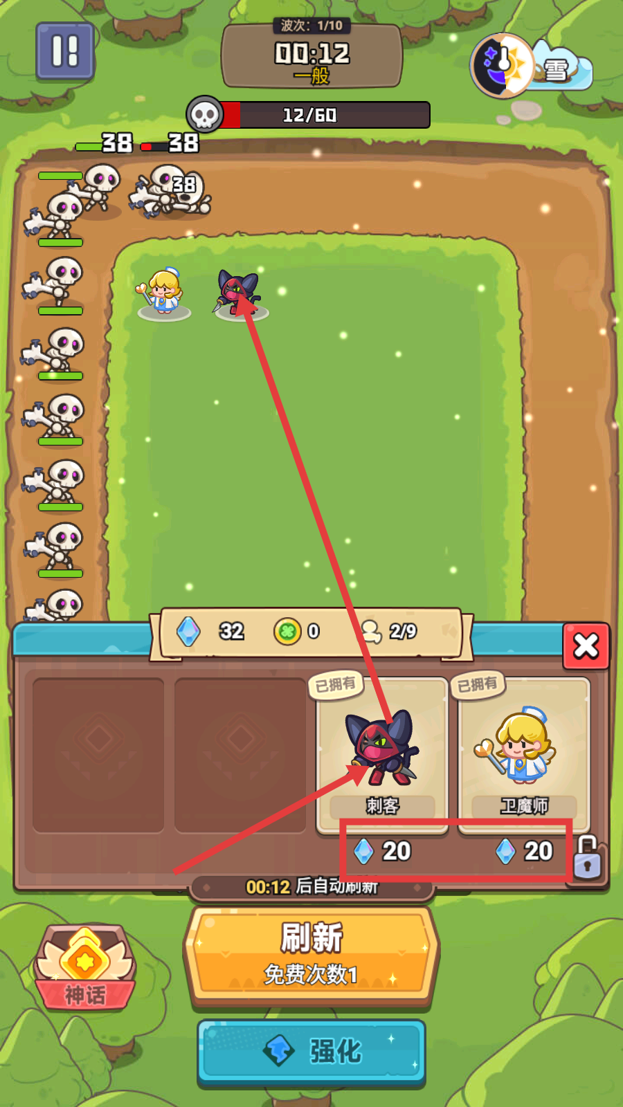 2、战斗过程中,当拥有足够钻石(如32钻石)时,可花费20钻石召唤【刺客】或【卫魔师】到战场,助力对抗骷髅敌人,提升队伍战力。