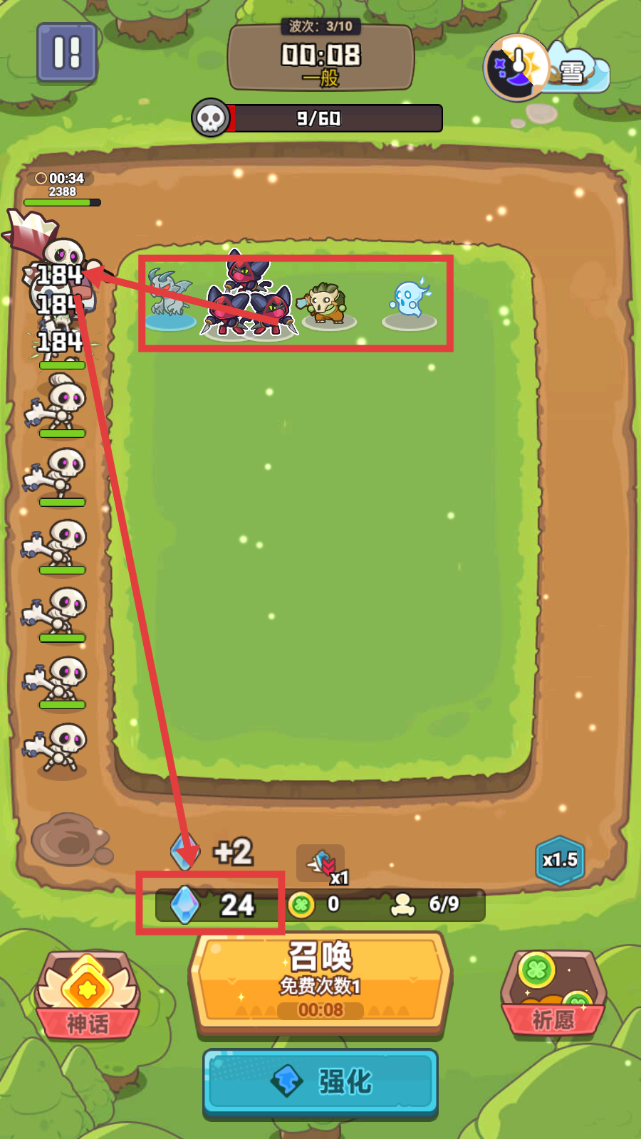 3、波次推进至【3/10】时,利用打怪获得的钻石(如当前积累24钻石),召唤更多角色,集中火力消灭骷髅敌人,进一步积累资源。
