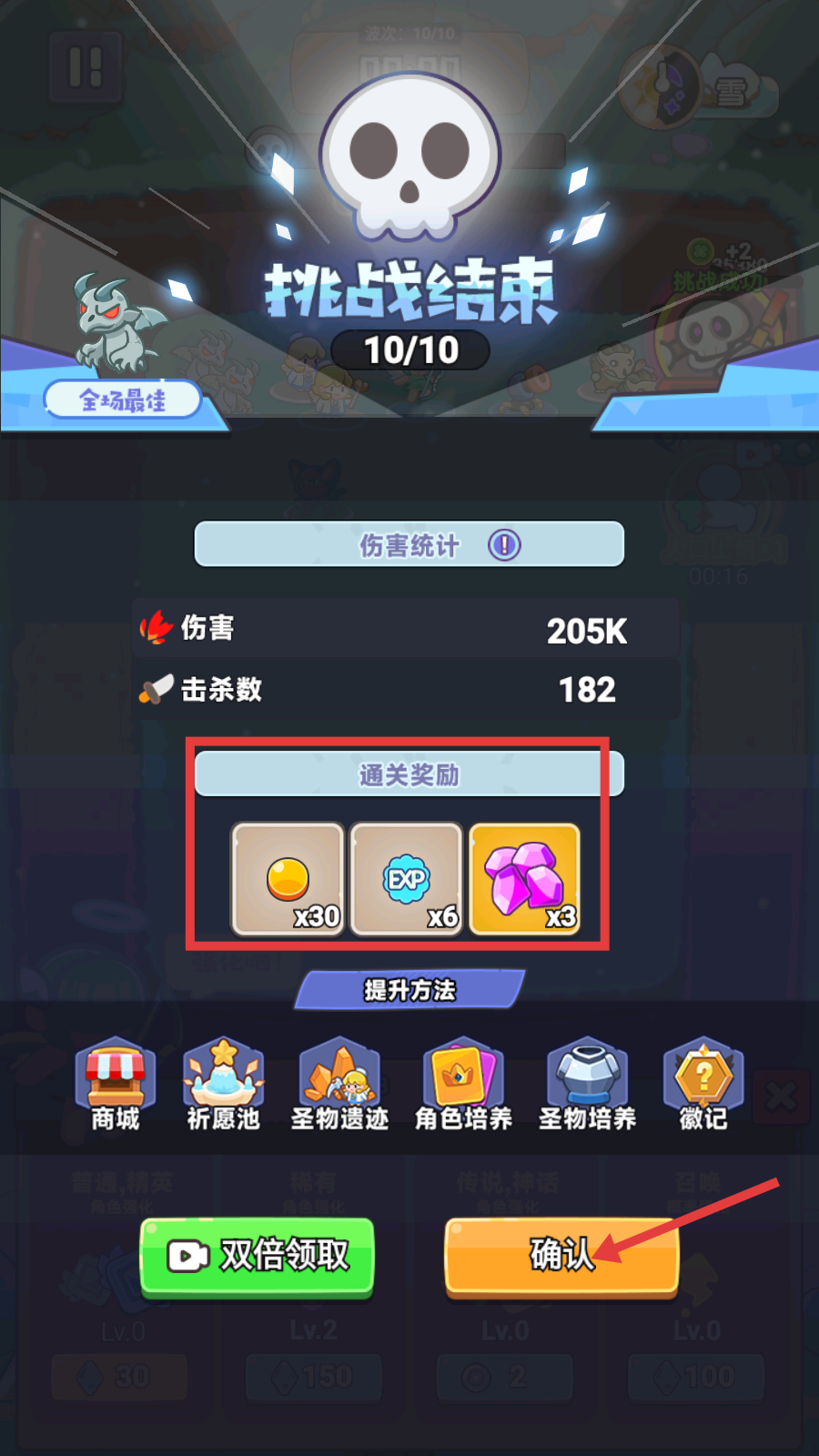 4、完成【10/10】波次挑战后,界面会显示伤害205K、击杀数182,此时可领取【金币x30】【EXP-x6】【紫色矿石x3】的通关奖励。