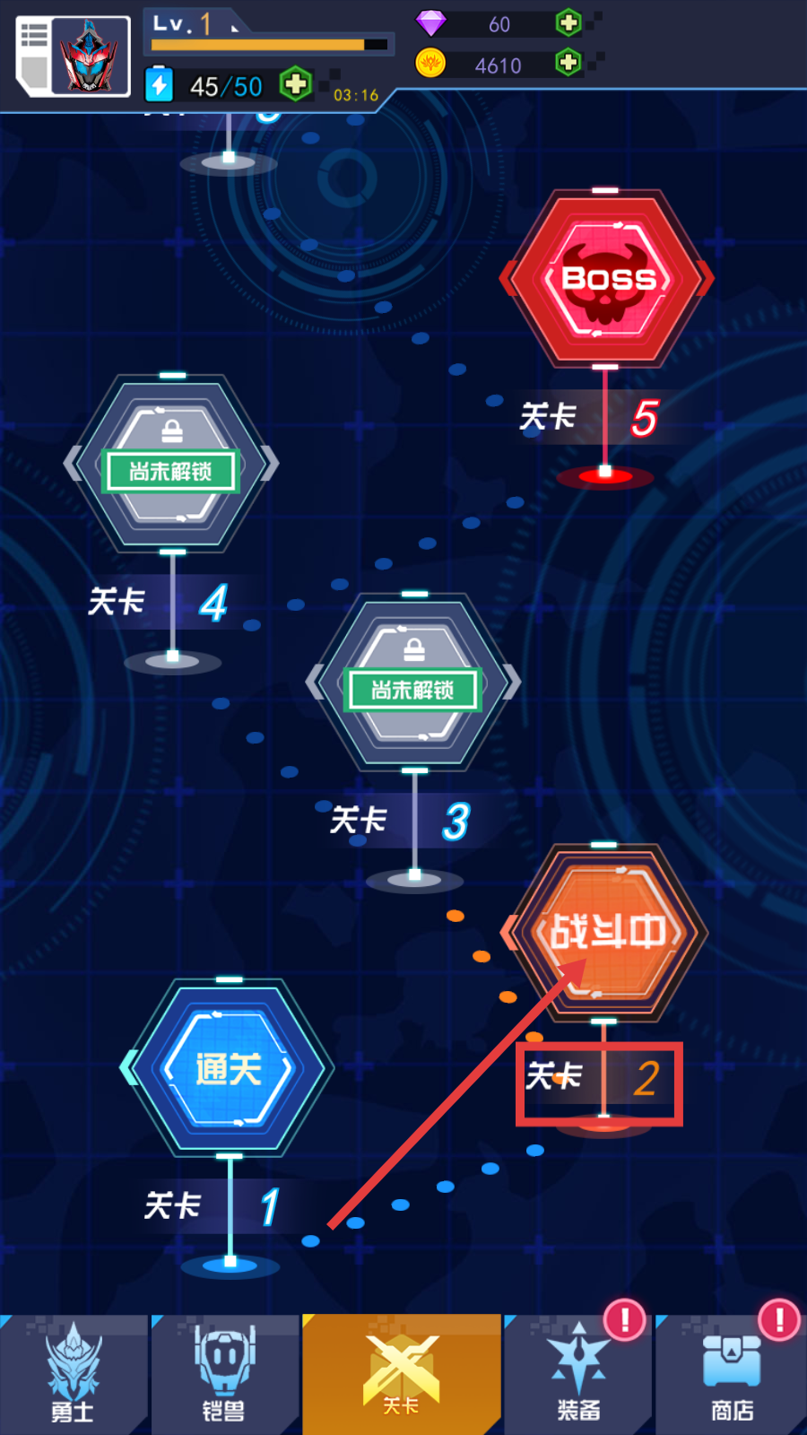 1、进入关卡界面,选择已解锁的【关卡2】进入战斗,逐步推进可解锁后续关卡与【BOSS】关卡。