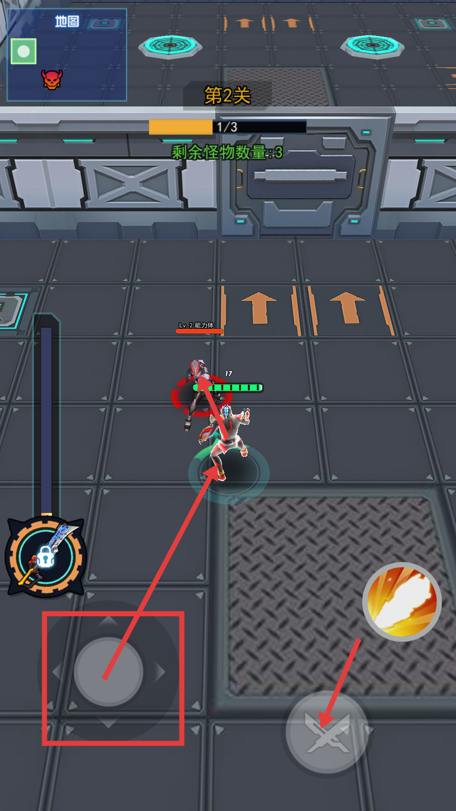 2、第2关战斗时,通过左侧摇杆控制角色移动,靠近敌人后点击右侧攻击按钮,攻击【Lv.2-能力体】等敌人。