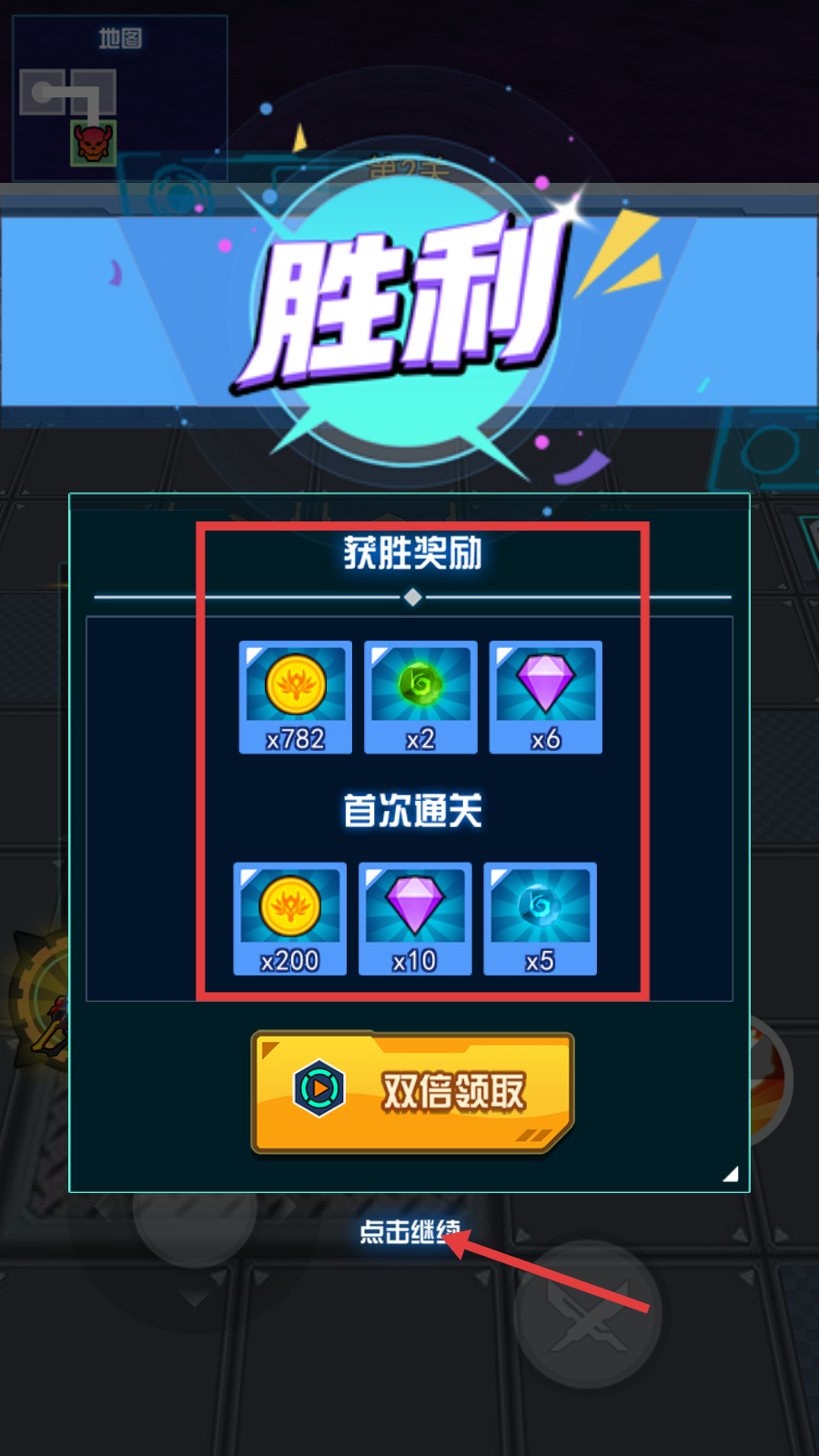 4、通关后可获取【获胜奖励】(金币x782等)与【首次通关】奖励,点击“点击继续”推进游戏,也能选双倍领取增加收益。