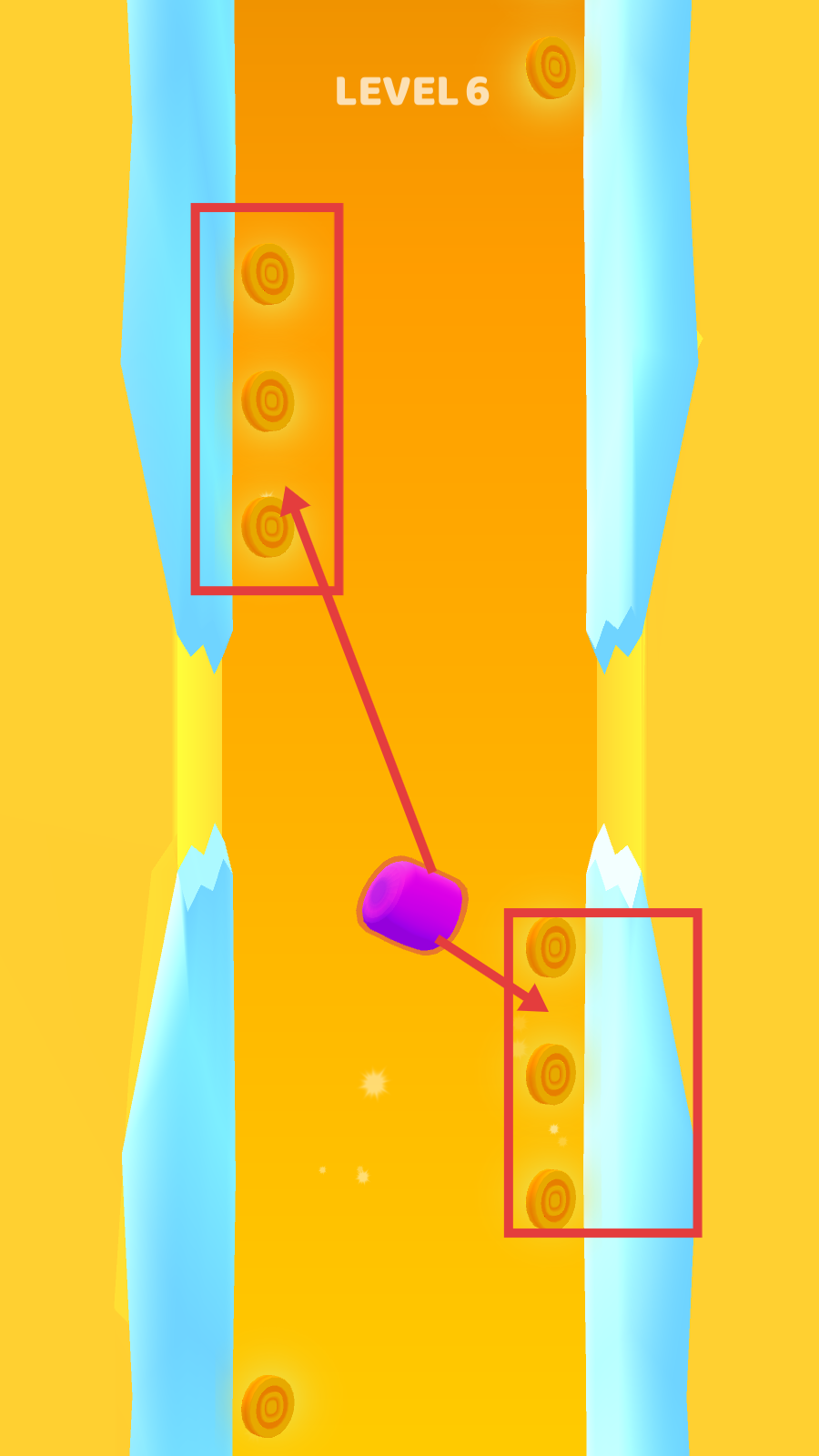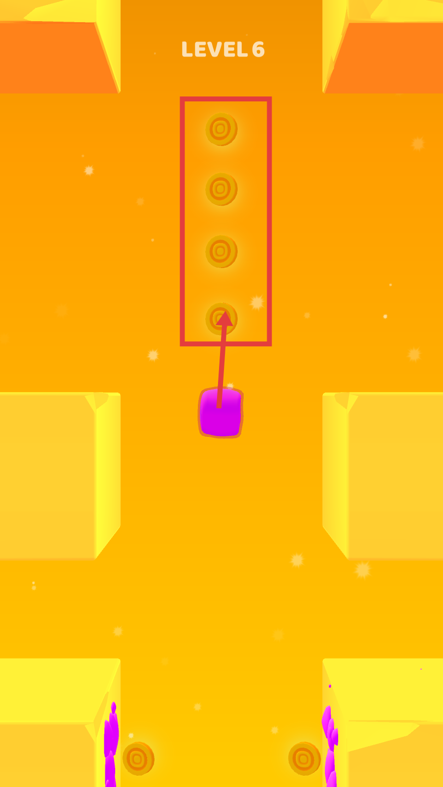 2、操控紫色方块,沿着箭头方向向上移动,收集一列的金色螺旋道具,积累关卡资源。