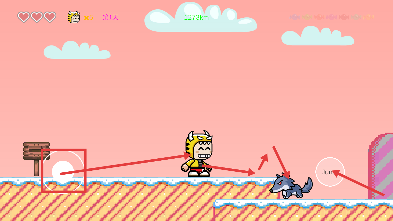 2、冒险中通过左侧操控按钮移动角色,注意躲避如狼一样的敌人,保证角色安全。