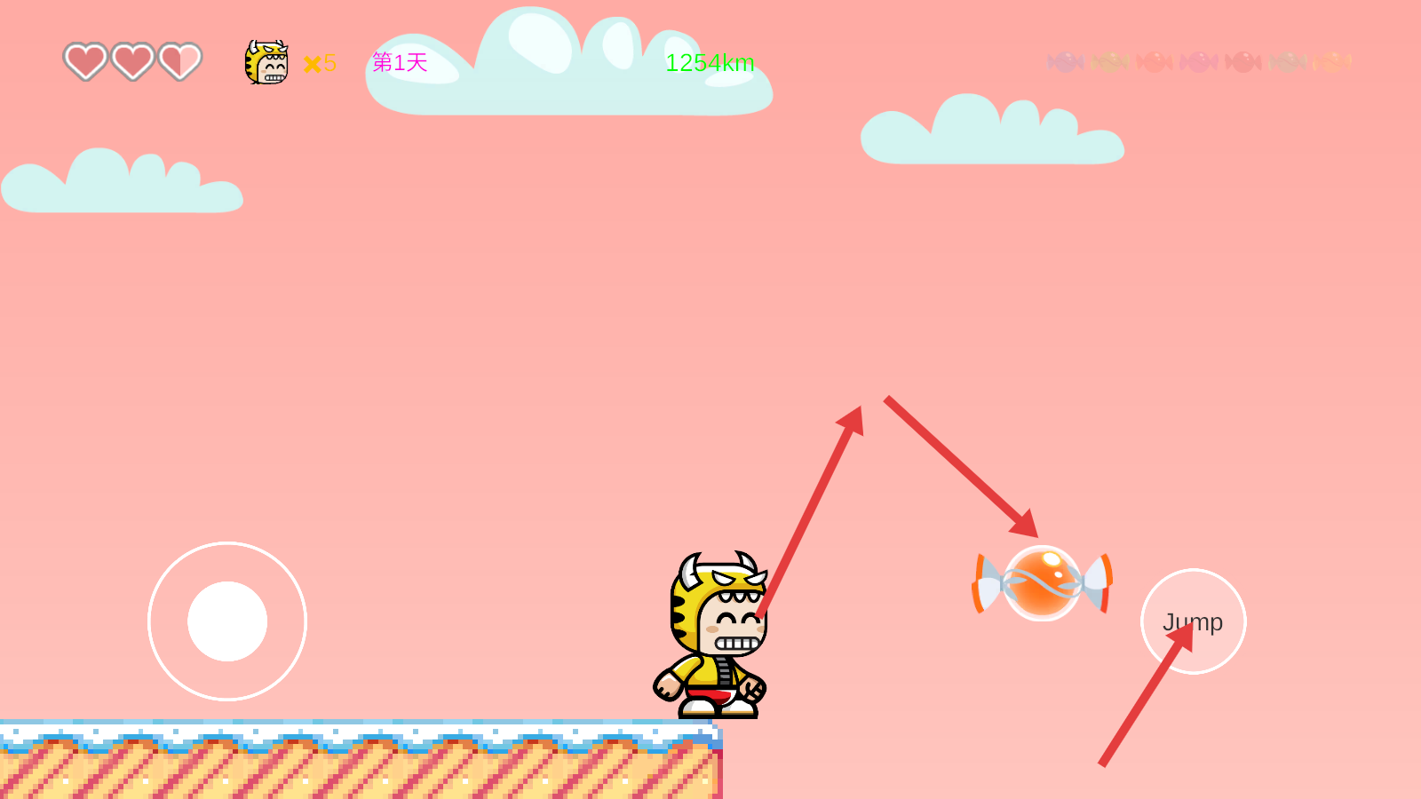 3、遇到糖果类道具时,点击“Jump”按钮让角色跳跃,从而收集这些道具。
