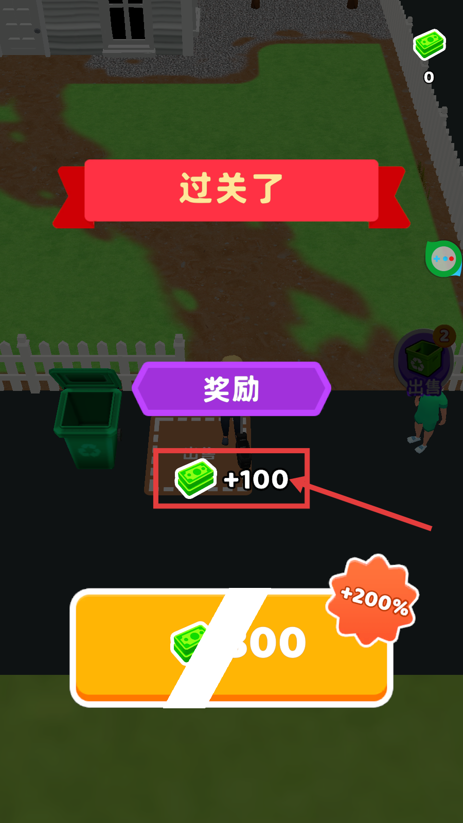 4、成功清理完所有杂草后,会显示“过关了”,此时可领取奖励,能获得金币(如+100金币),也可选择翻倍奖励。