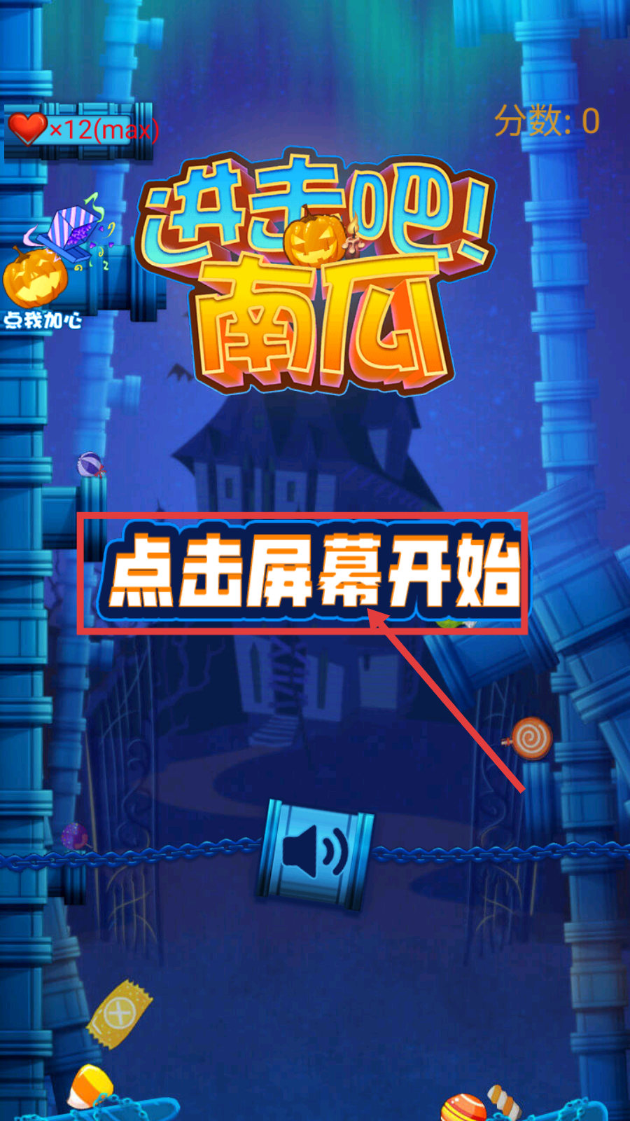 1、进入【进击吧!南瓜】游戏,点击屏幕开始,开启南瓜的冒险挑战,准备在场景中收集物品。