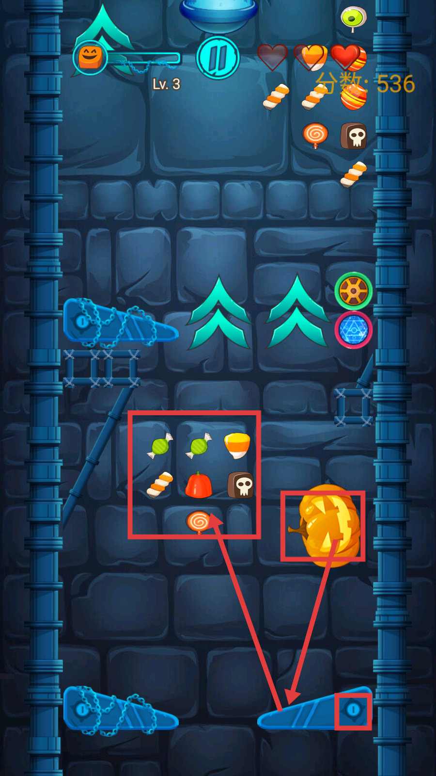 2、冒险中,操控南瓜在带有机关的场景里移动,收集糖果、南瓜等物品,利用蓝色机关辅助移动,同时避开危险元素。