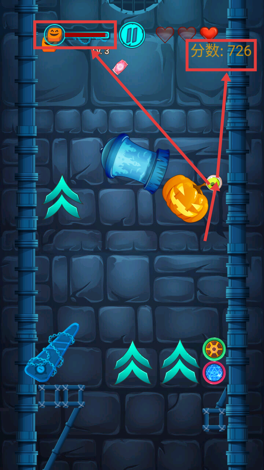 3、过程中留意左上角南瓜的状态条,以及右上角分数,通过收集物品提升分数,尽量保证南瓜状态良好。