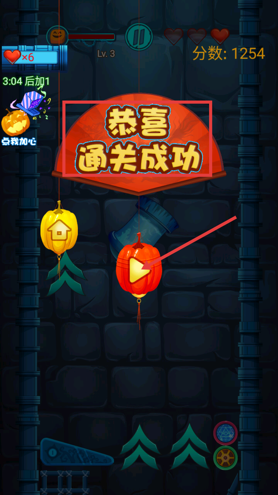 4、成功通关后,界面显示【恭喜通关成功】,点击红色南瓜形状的继续按钮,可进入下一关或查看结算。