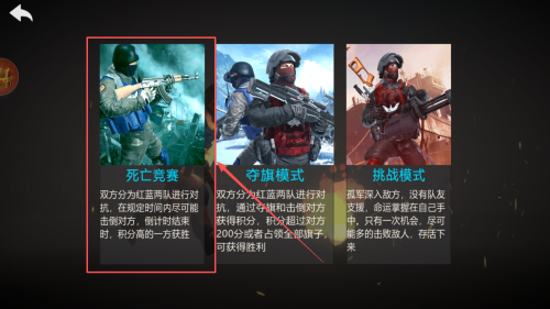 2、在游戏模式选择界面,点击“死亡竞赛”、“夺旗模式”或“挑战模式”按钮,选择你想要的游戏模式。
