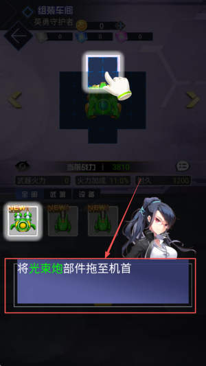 1、如何组装战机,点击“将光束炮部件拖至机首”按钮,将部件拖动到指定位置进行组装。