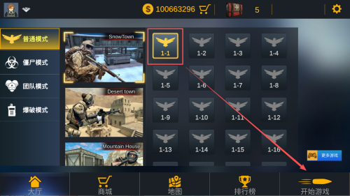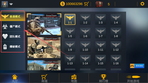 2、如何选择游戏模式,点击“普通模式”、“僵尸模式”、“团队模式”或“爆破模式”按钮,选择你想要的游戏模式。