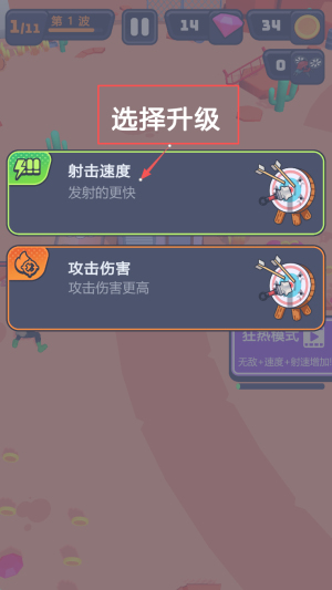 4、如何选择升级,在升级界面,点击“射击速度”或“攻击伤害”按钮,提升防御塔的能力。