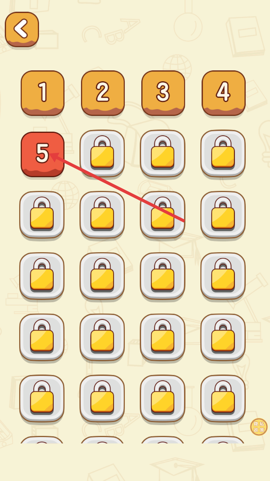 1、进入游戏后,可选择关卡,前4关已解锁,点击【5】号关卡即可开始挑战,推进游戏进程。
