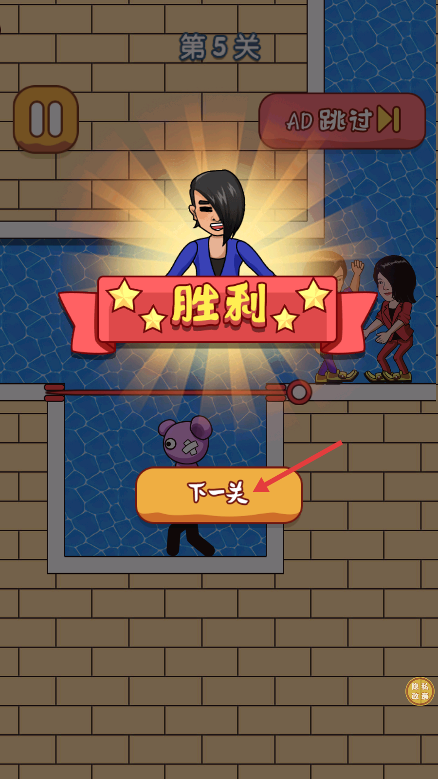 4、成功通关第5关后,界面会显示【胜利】,此时点击【下一关】按钮,继续挑战后续关卡。